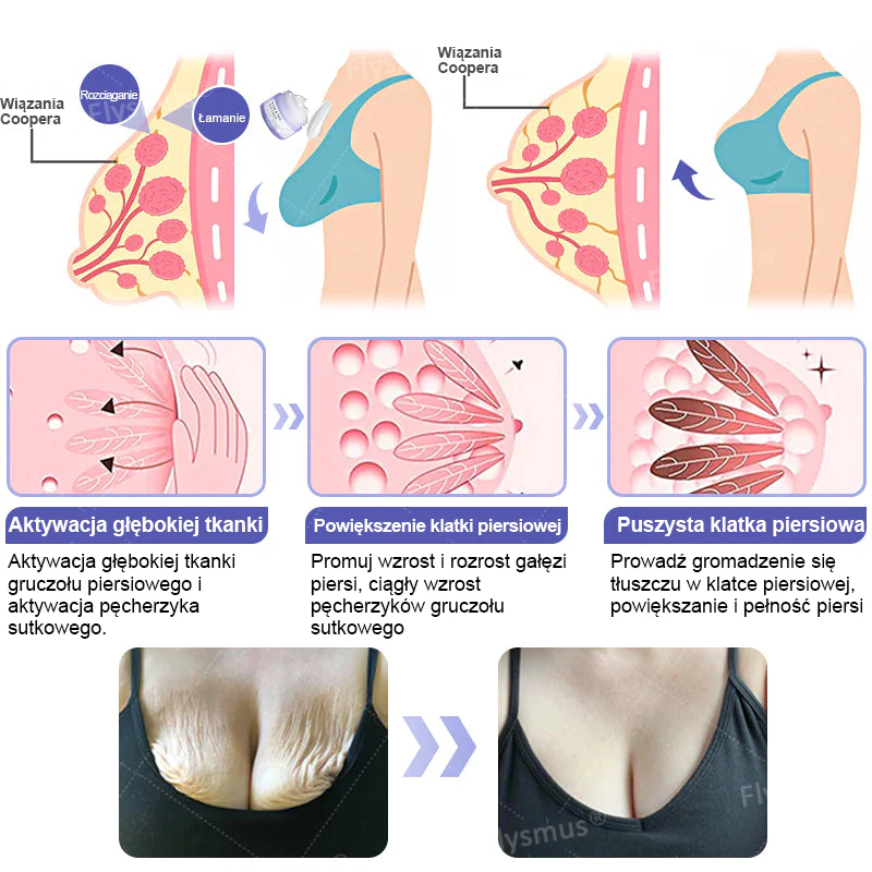 Uzyskaj wzmocnienie i podniesienie piersi, złagodzenie dyskomfortu piersi oraz zapobieganie/leczenie schorzeń piersi.