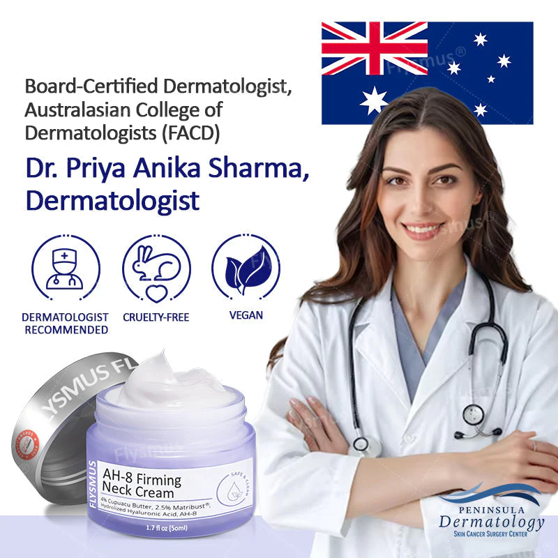 Flysmus® AH-8 Neck Cream do napinania i liftingu szyi uznawany jest za najskuteczniejszy produkt przeciwstarzeniowy w 2024 roku i cieszy się wysoką rekomendacją doktor Trisha Khanna